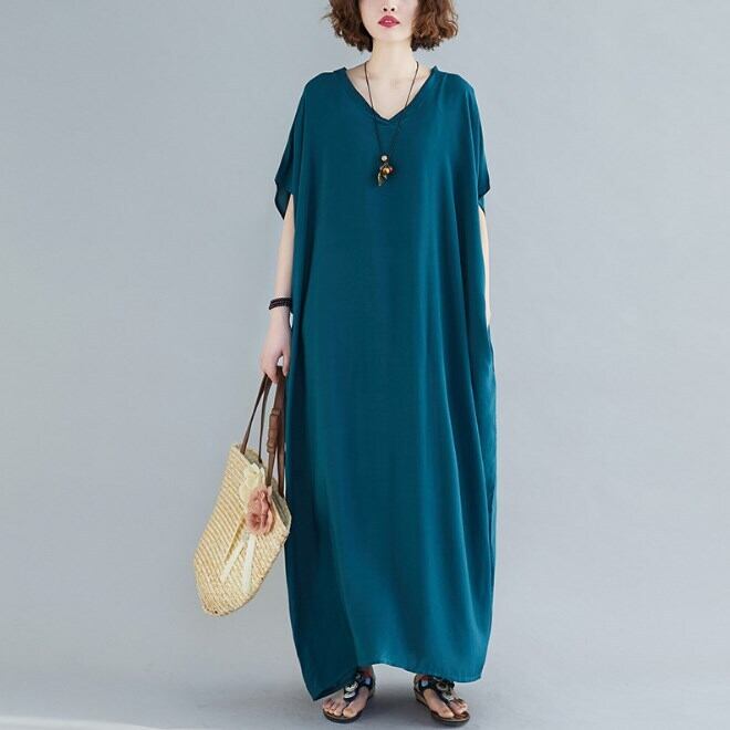 ゆったり着られるシンプルなデザインのマキシ丈ワンピース。